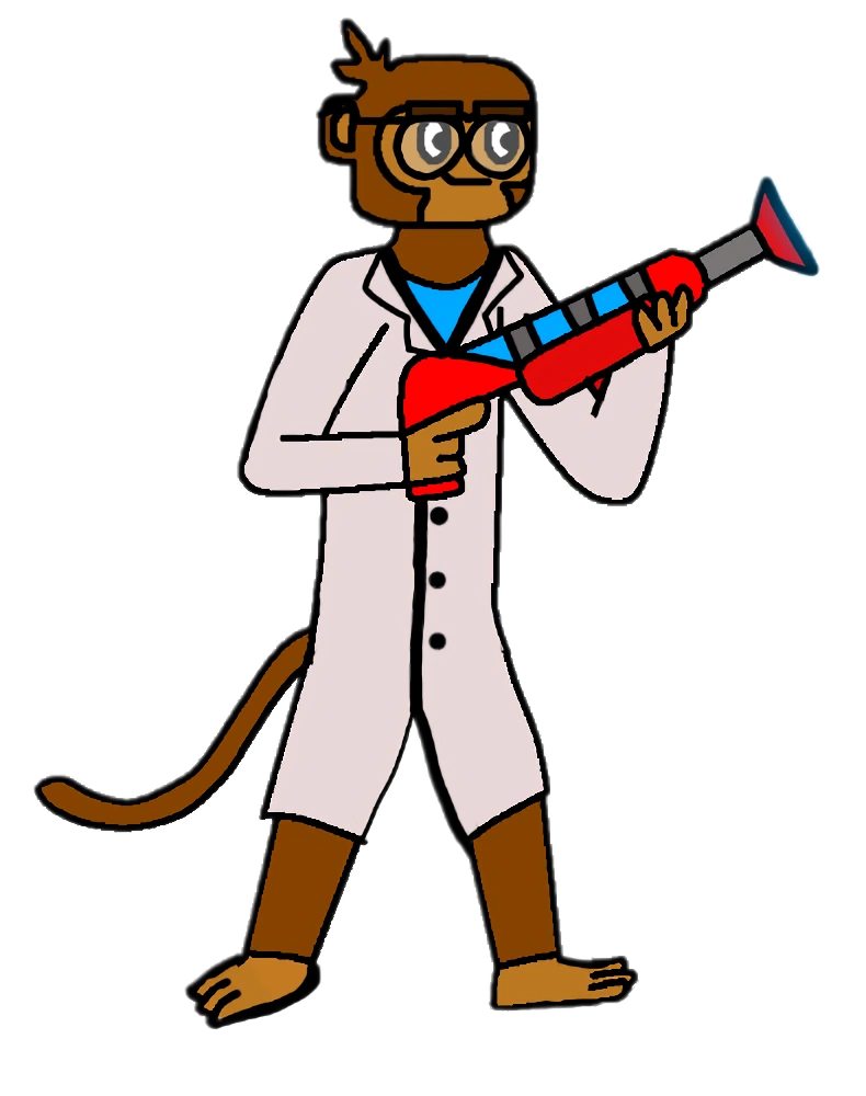 Physicist Monkey's appearance is similar to that of the Dart Monkey, wearing a white lab overcoat with a light blue shirt inside and black glasses, and holding a red raygun. Shots fired by the weapon is cyan-colored.